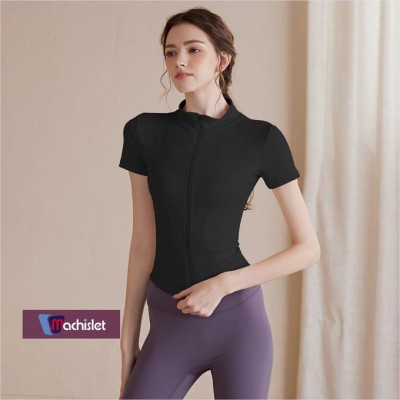Machislet Women's Running Slim Full Zipper Stand-up Collar Fitness Casual Short Sleeve Sports Workout Jacket-Black