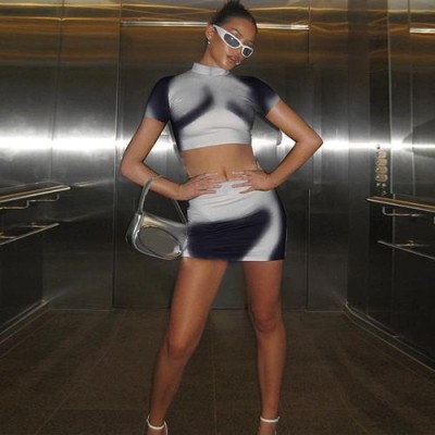 Women 2Piece Short Sleeve Skirts Sets Female Print Gradient Turtleneck Crop T-Shirt Skirt Summer Streetwear